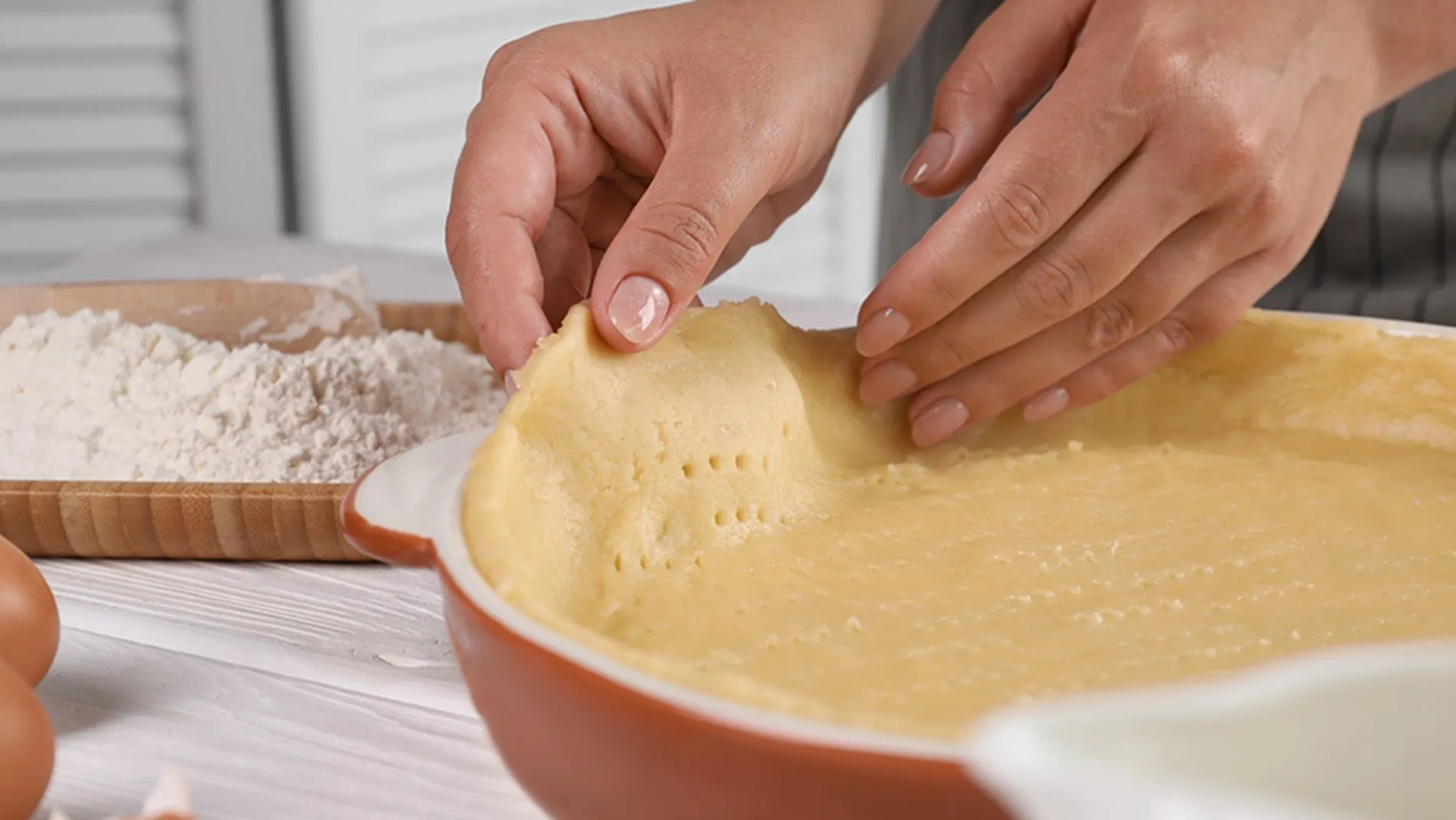 1. Frământați un aluat neted din făină, unt, ou, sare și apă și lăsați-l la rece aproximativ 30 de minute.